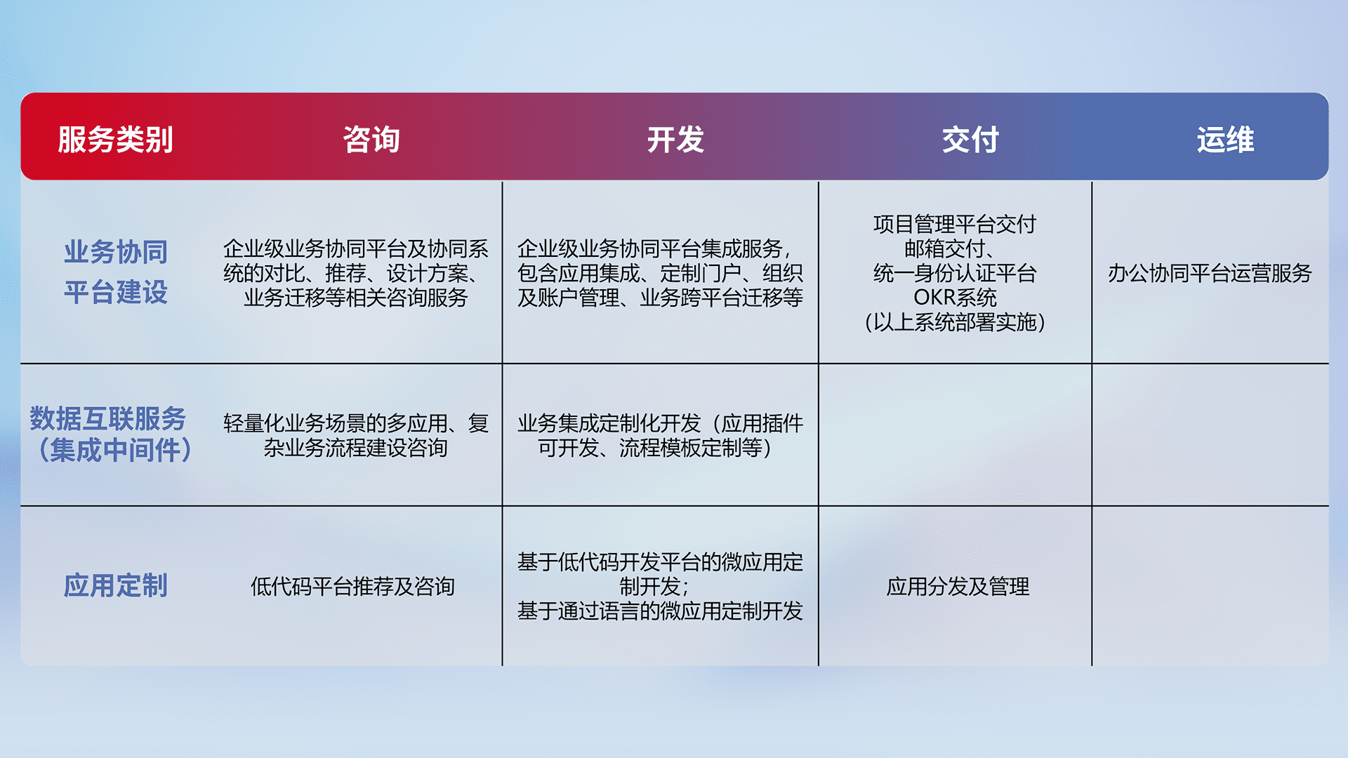 针对钉钉、、、、企微、、、IDaas等平台级产品提供产品的规划、、、、方案、、、交付、、、定制化开发等服务,,实现如统一协同办公、、、智能客户服务、、混合会议管理、、智能数据查询、、、、等业务场景,,,实现数字化转型。。。。